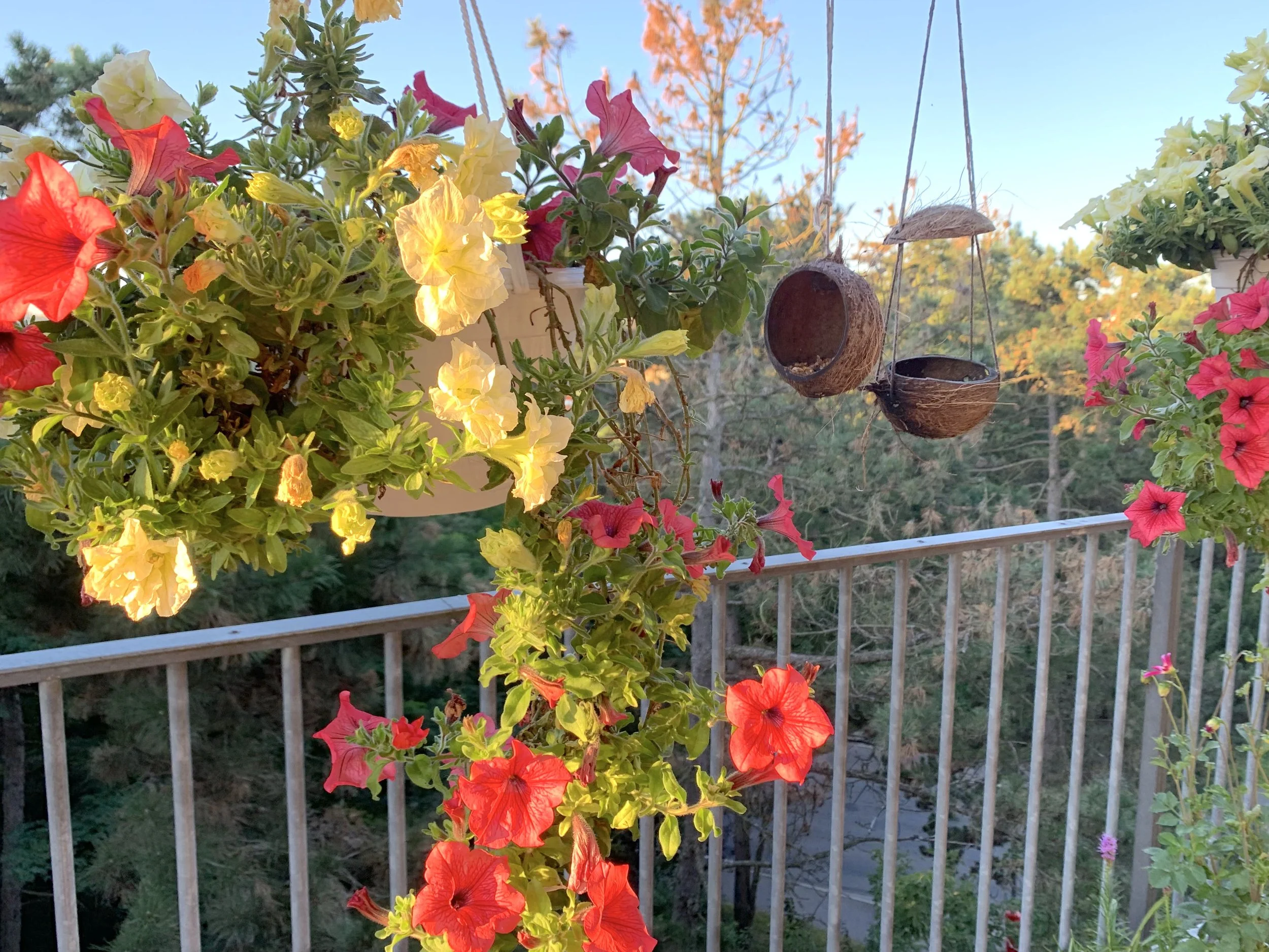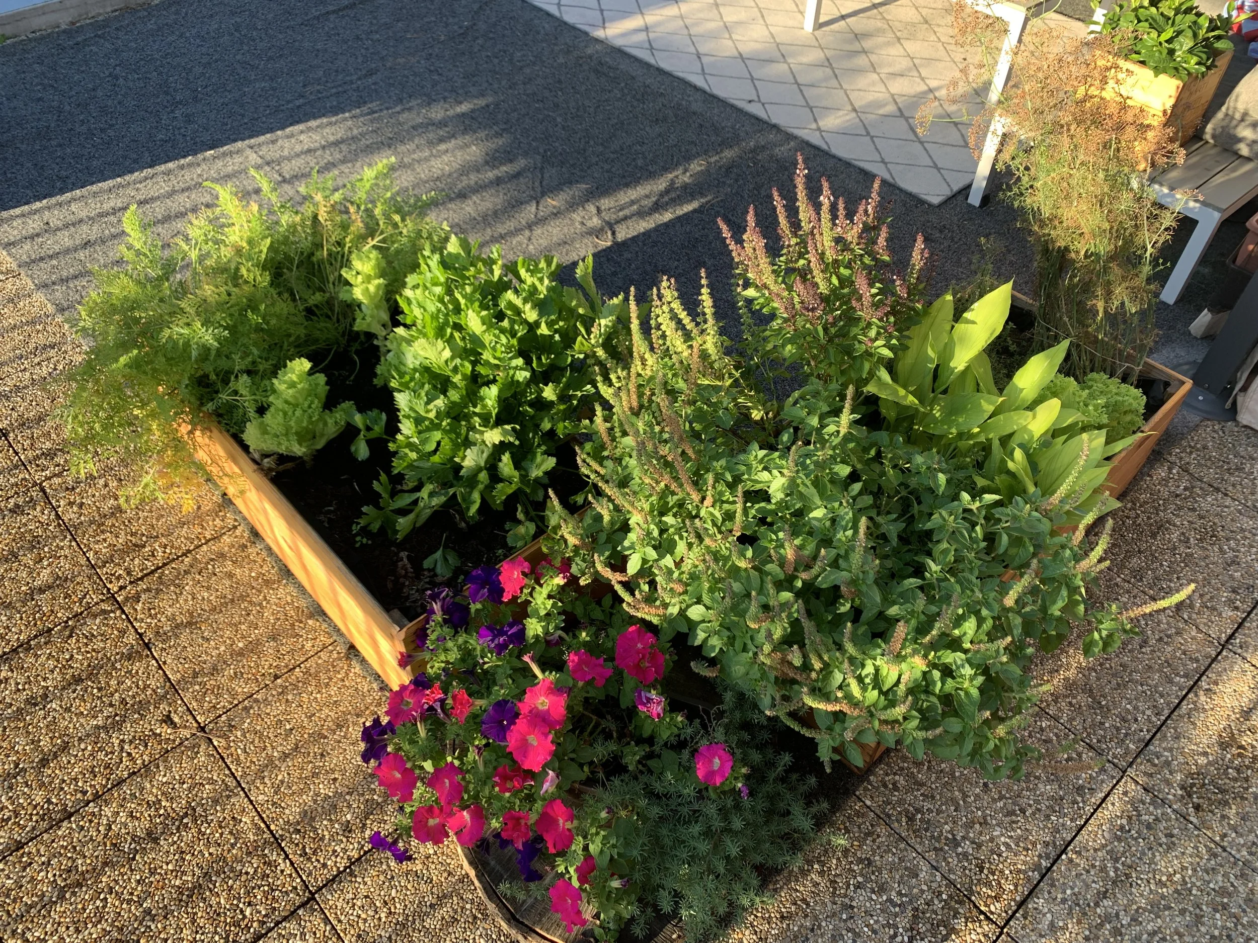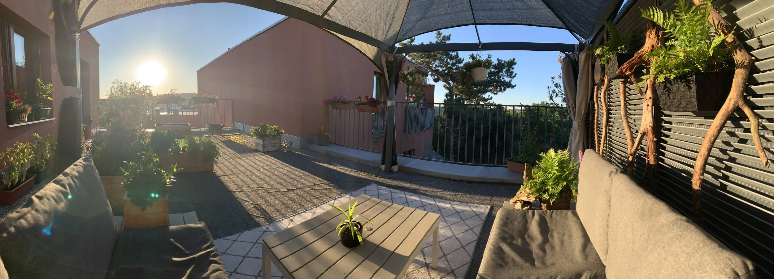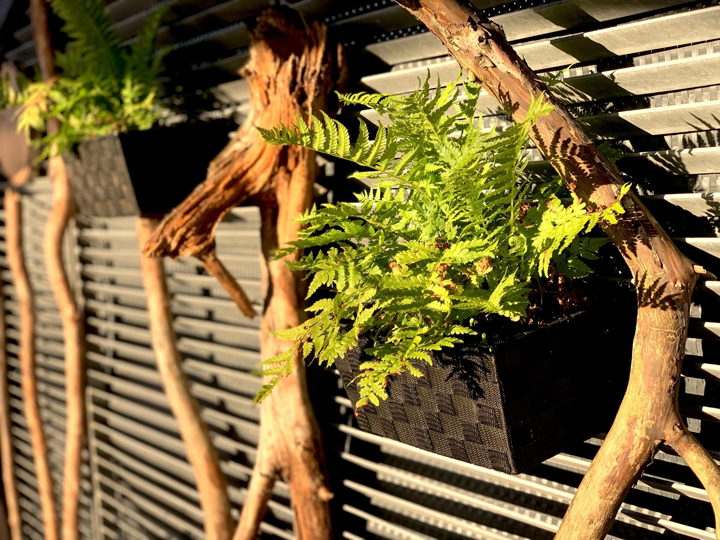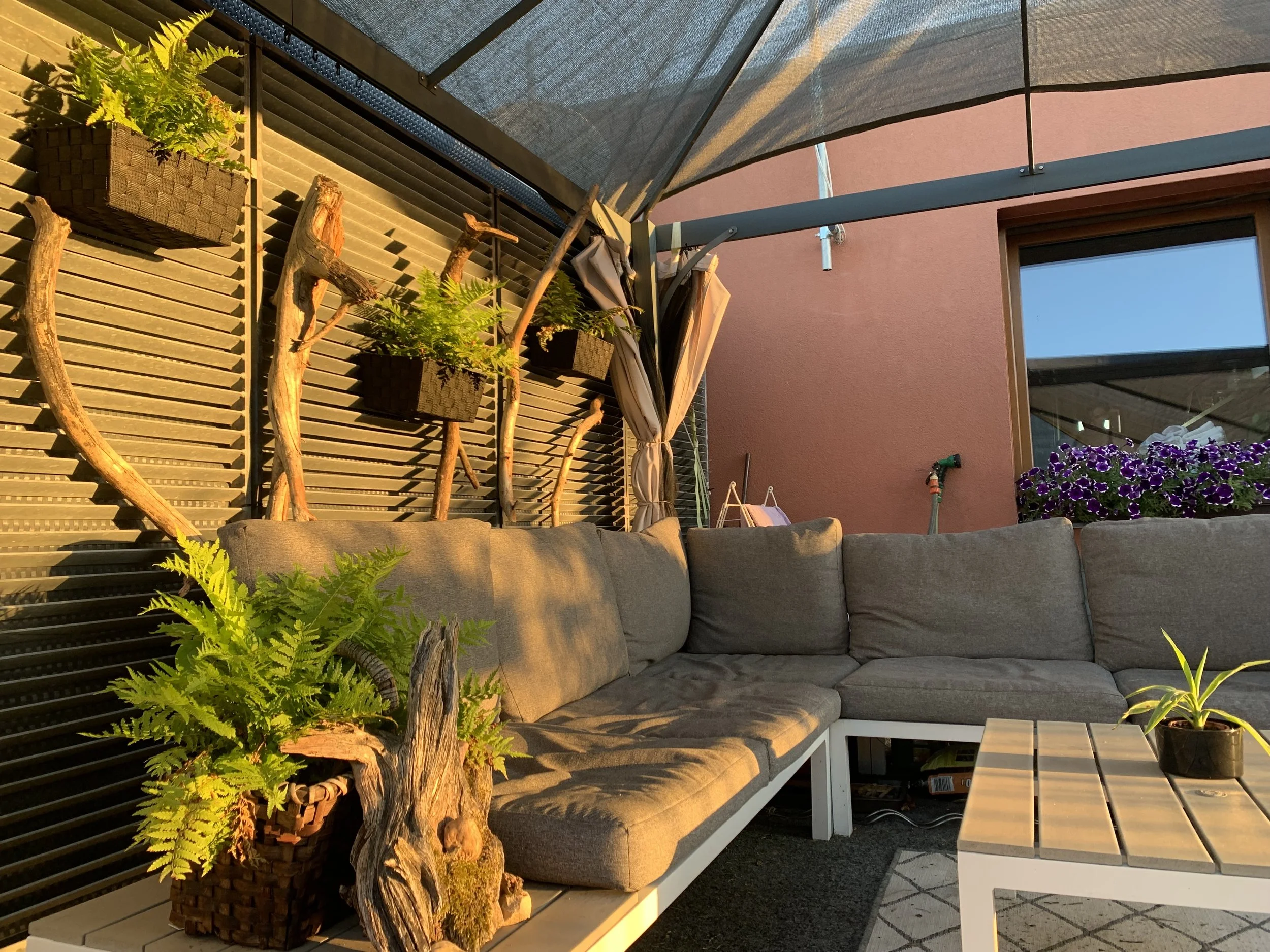 Odpočinkovou část terasy, kde byla již umístěna kovová pergola s venkovními sedačkami a stolkem, byla osazena zelenou stěnou, kokosovými krmítky pro ptáky a závěsnými květináči. Na okenní parapety a zábradlí se umístily truhlíky s letničkami a bylinkami.