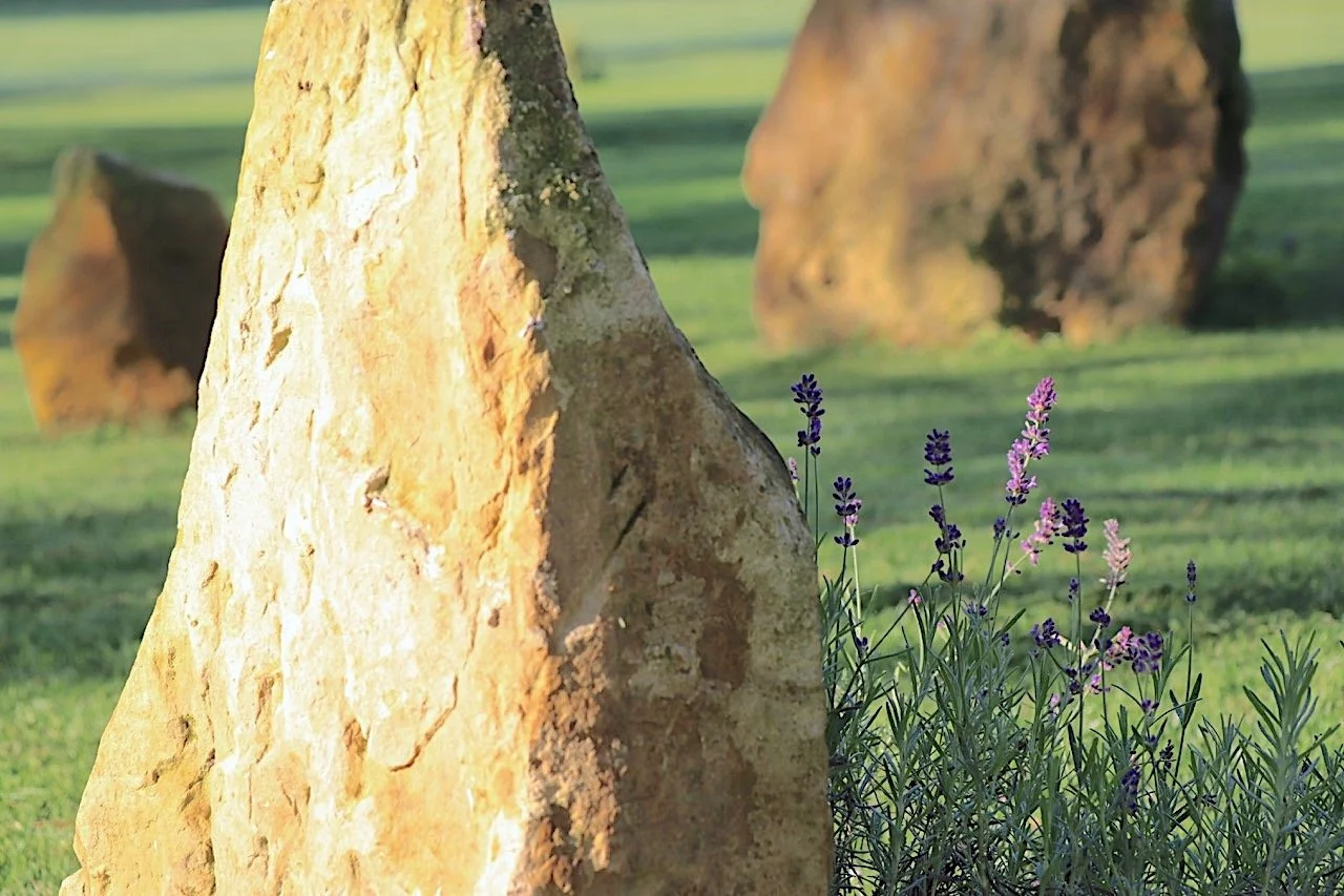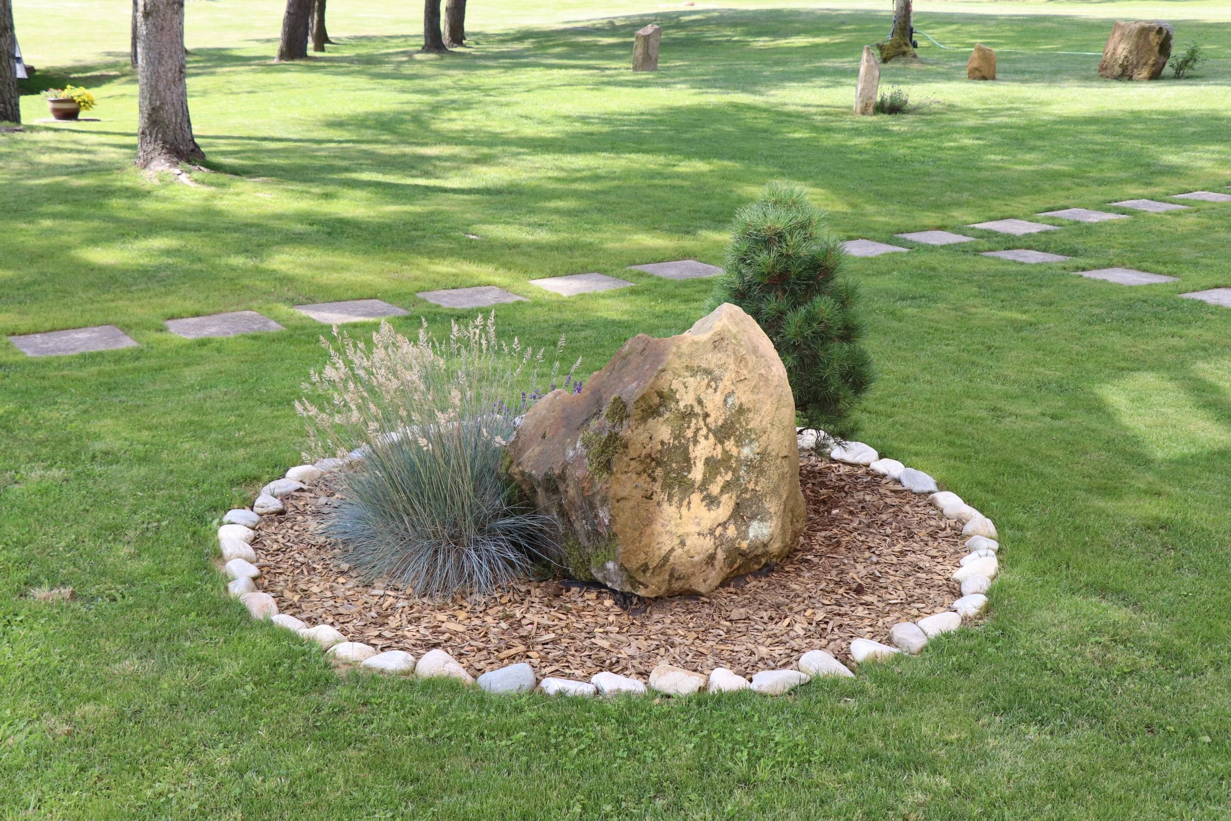 Pískovec a beton s květinami, travinami a jehličnany, ze kterých jsme tvořili solitérní prvky a cesty, vynikali ve velkém prostoru a zvýraznili krásné travnaté plochy.